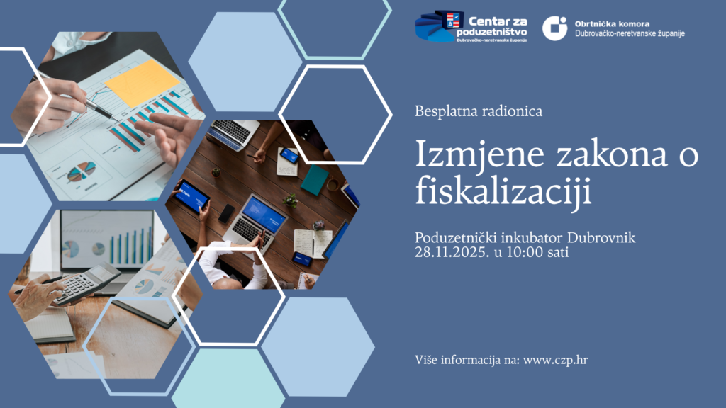 Novi sustav donosi obveze koje će utjecati na vaše svakodnevno poslovanje, stoga je pravo vrijeme da se pripremite! Centar za poduzetništvo Dubrovačko-neretvanske županije u suradnji s Obrtničkom komorom Dubrovačko-neretvanske županije i Udruženjem obrtnika Dubrovnik organizira radionicu na kojoj ćemo vas provesti kroz sve ključne novosti i pomoći vam da ih razumijete – bez tehničkog žargona i bez panike.